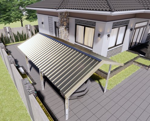 An efficient covered structure used to offer limited protection to vehicles from sun and rain, consisting of a roof supported on posts, built beside a building.